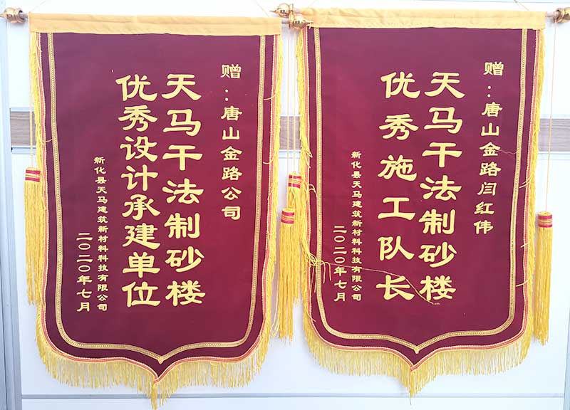 近日,天马建筑项目负责人将两面印有“天马干法制砂楼,优秀设计承建单位”、“天马干法制砂楼,优秀施工队长”的锦旗送到了唐山金路安装队长闫红伟的手上。