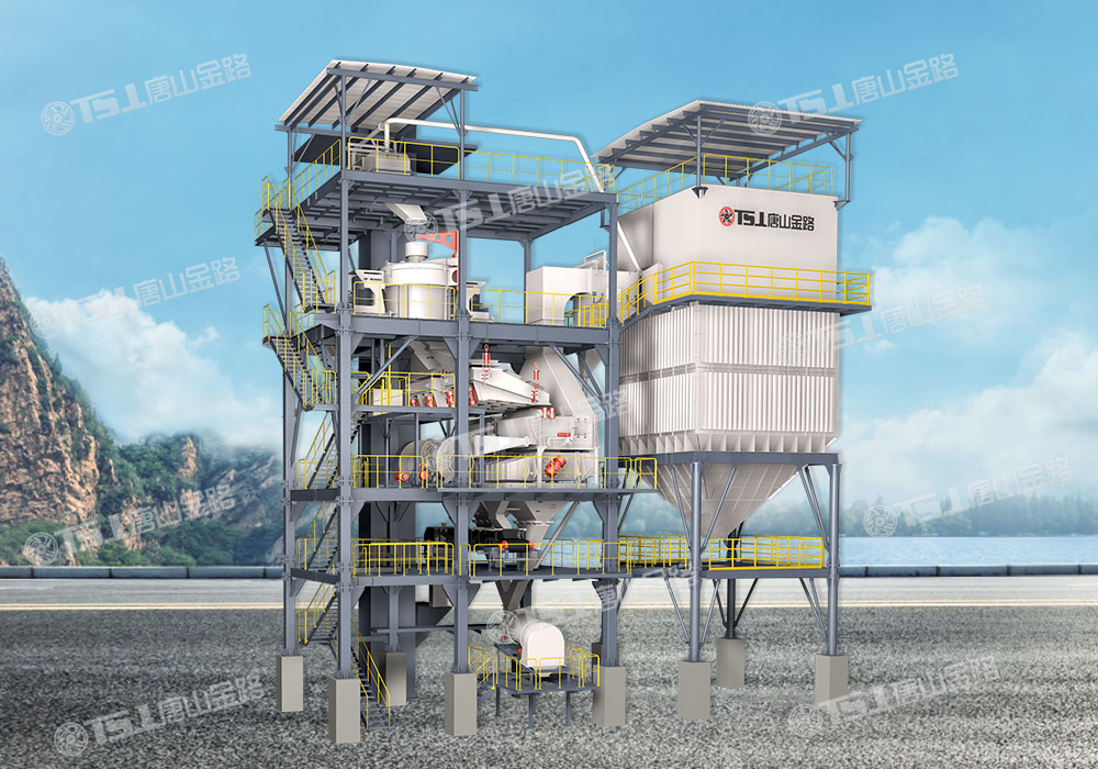 唐山金路V9干式制砂楼主要用于高品质机制砂的生产中,由五孔碾磨制砂机、空气筛、粗细粉分离机、加湿拌合机等设备组成。